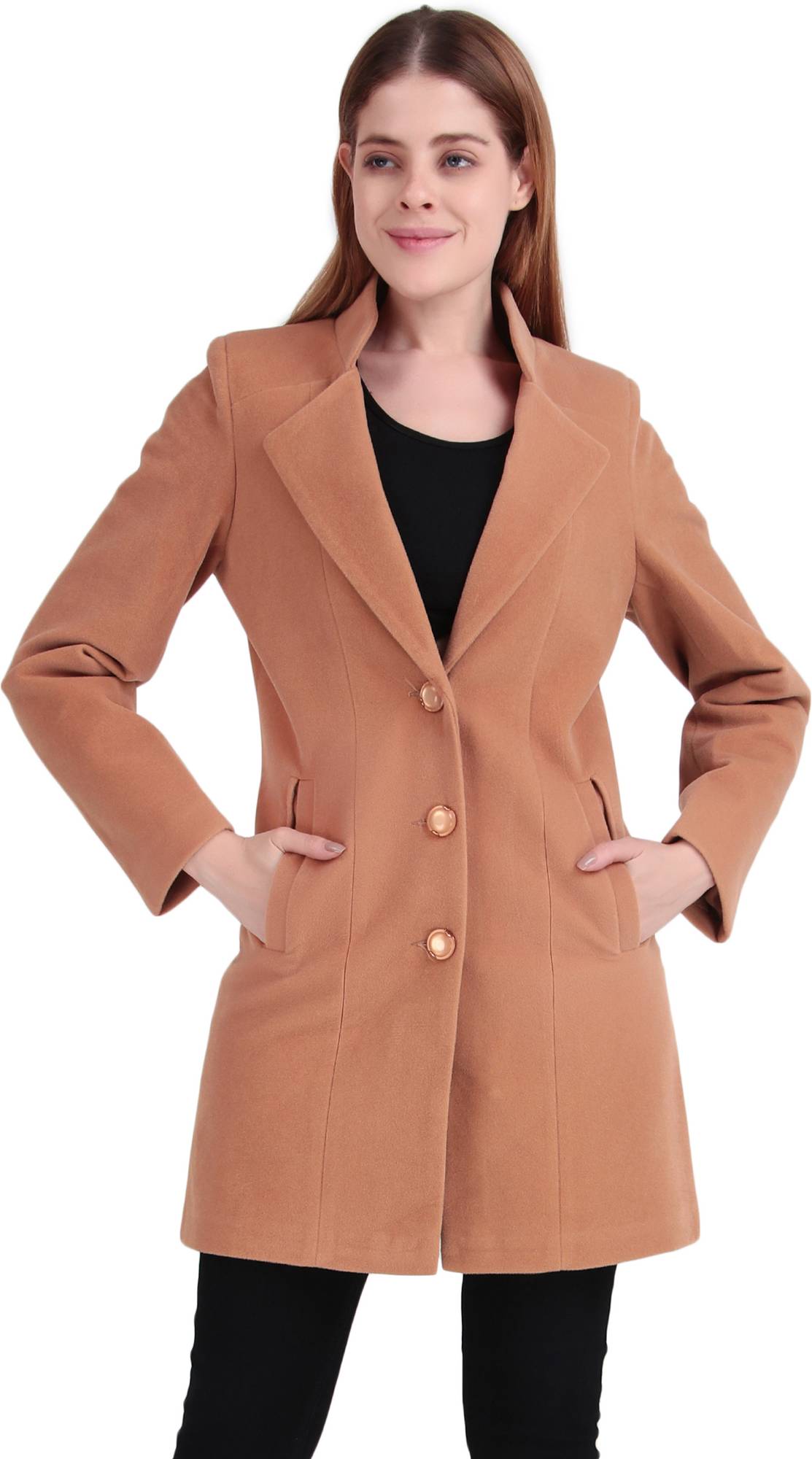 Stay warm and stylish with this Brazo women's coat, featuring a soft, solid colors that is easy to pair with any outfit. The coat has a flattering, fitted design with a classic collar, making it perfect for both casual and formal occasions. It has two convenient pockets and is secured with three matching buttons on the front for a neat and polished look.