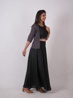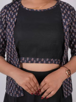 Featuring a blend of floral patterns the jacket and the border of the top with solid pattern, the set is an excellent choice for various occasions. Whether you are attending a casual party, a wedding, or a festive celebration, the set will ensure that you look put-together and elegant. The blend of patterns ensure a minimal yet creative look that ups your style game.