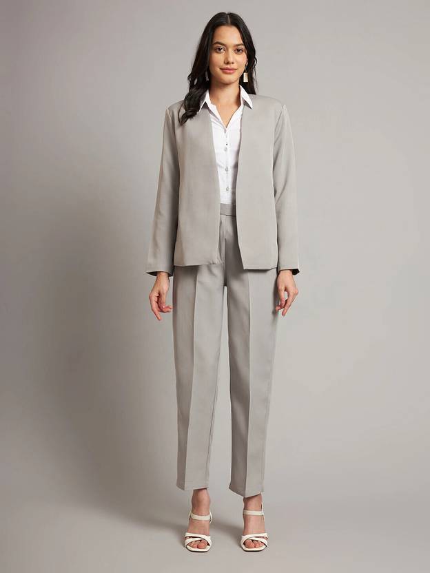 Formal Blazer with Trouser. Solid Regular fit open front blazer is collarless has long sleeves and 2 Pockets. Solid Mid rise trouser has a zip fly with a button and a hook & bar closure, two pockets and a waistband with a belt loops. Elegant Women’s Formal Solid Suit – Timeless Professional Style