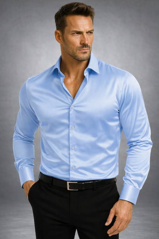 This is a men's long-sleeved shirt crafted from a lustrous yellow satin fabric, offering a smooth and shiny finish. It features a classic collar, a full button-down front with contrasting white buttons, and buttoned cuffs. The shirt has a tailored fit, designed to complement the wearer's physique. Its elegant material and vibrant color make it suitable for party wear or festive occasions. This shirt can be paired with black trousers, dark-wash jeans, or dress pants for a sophisticated and striking look.