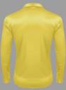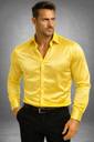 This is a men's long-sleeved shirt crafted from a lustrous yellow satin fabric, offering a smooth and shiny finish. It features a classic collar, a full button-down front with contrasting white buttons, and buttoned cuffs. The shirt has a tailored fit, designed to complement the wearer's physique. Its elegant material and vibrant color make it suitable for party wear or festive occasions. This shirt can be paired with black trousers, dark-wash jeans, or dress pants for a sophisticated and striking look.