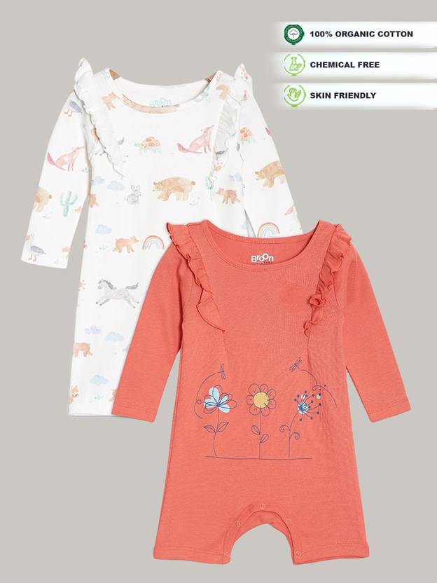 BROON Organic Cotton set of 2 Full Sleeve Rompers featuring designful motifs and prints are a perfect choice for your baby. Produced from super soft Organic Cotton fabric these rompers come with a round neck and snap button closure at the crotch with a snug fit for your little one. These Rompers are produced from Skin Friendly fabrics without any hazardous chemicals and are must have in your little one's essential wardrobe.