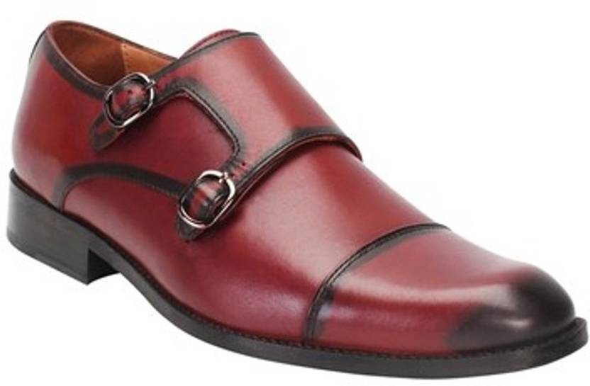 WINE COLOR GENUINE LEATHER CAP TOE DOUBLE MONK STRAP FORMAL SHOES BY BRUNE