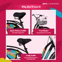 Add a splash of fun, colour, and convenience to your rides with the BSA Ladybird Splash 24T. Designed for young girls and women, this trendy bicycle combines comfort, durability, and style, making it the perfect companion for daily commutes, leisure rides, or fun outings with friends. Built with a low step-through frame, the Splash ensures easy mounting and dismounting, while its vibrant graphics bring out a lively and youthful vibe. The cycle is equipped with comfortable cushioned saddle, broad mudguards, and non-slip pedals, ensuring safe and hassle-free rides. Its sturdy build quality guarantees long-lasting performance, while the colorful design adds a touch of personality wherever you go.