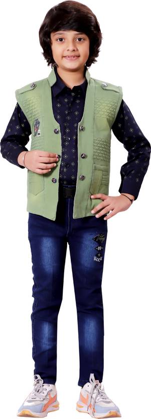 We presents exclusive 3 Piece Party wear clothing set. This party wear suit set comes with Shirt, Jacket and Jeans. Featuring sleeveless denim waistcoat With printed shirt. The waistcoat features embroidery at back side, button closure at front and two pocket, Jeans has back Elastic Waistband. Suitable for party, wedding, festival, birthday celebration or any other occasion.