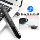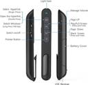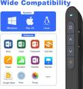 Other Features | - Presentation remote control support options: MS Word, Excel, PowerPoint, ACD See, website, iWork (Keynote & Numbers & Pages)?Google Slides, Prezi etc, One-piece design, the mini USB receiver stored in presenter tail with a magnet system makes it portable to carry and easily plug into your computer's USB port., Powerpoint clicker support Hyperlinks, Volume Control, Full Screen, Black Screen, Switching Windows, Page up/down; Plug & Play, no need to install driver. Silicone push-button provides a soft touch feeling for your thumb. A raised bump on the button offers a clear signal to prevent pressing the wrong button., Environmentally friendly ABS shell design, using 2.4G RF chip, 360 degree free control, no direction restrictions, control demonstration is not disturbed. The Presenter demonstration is remotely controlled up to 50ft, so you can move around the room and interact with your audience.
