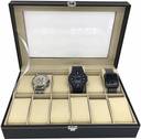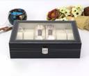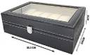 Keep your watches and jewelry free from dust, Opens easily with one hand only., Clear Glass Framed Lid, Contrast Stitching, 12 Pillow Filled Slots, Material: PU Leather, Colour Box: Black