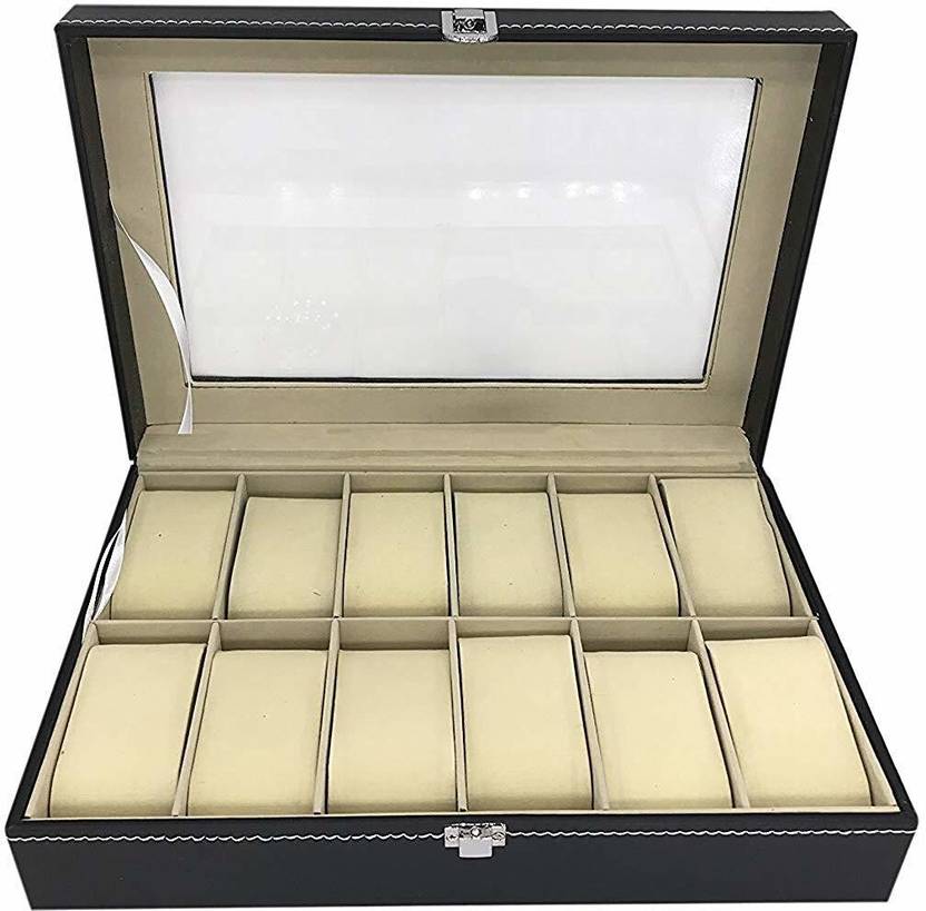 12 LARGE COMPARTMENTS- Each watch cushion holds a small or large watch neatly in place . There is plenty of space between the lid and cushions to accommodate watches of all size, STURDY & SECURE LOCK: Keep prying hands away from your prized possessions. Our womens and mens watch case features a sturdy lock that keeps your watches safe & keeps them from falling out and shattering if the box falls, FRAMED GLASS LID: Why not show off your watches to family and friends, with this watch display case that features a framed glass lid to display your beautiful collection, Each watch cushion holds a small or large watch neatly in place . There is plenty of space between the lid and cushions to accommodate watches of all size