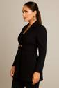 Elevate your wardrobe with this elegant longline blazer designed for a chic and polished look. Featuring a classic notch lapel collar, long sleeves, and a tailored silhouette, this blazer is perfect for both formal and semi-formal occasions. The design includes a sleek waist belt detail with dual gold-tone buttons, enhancing the structured fit and adding a touch of sophistication.