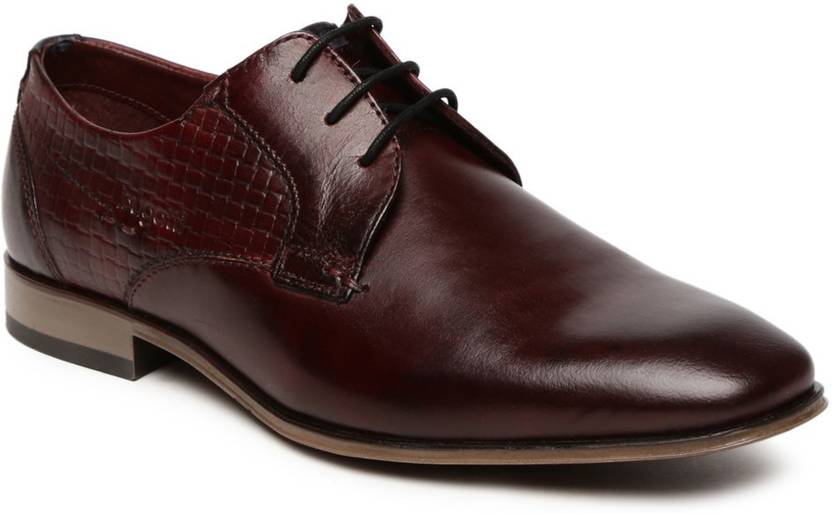 A pair of burgundy Derby formal?shoes?with central lace-upsTextured leather?upperCushioned footbedTextured outsole, has a stacked heelWarranty: 3 monthsWarranty provided by Brand Owner / Manufacturer. A fabulous design and make define this awesome pair of formal shoes by Bugatti. Team it with your formal wear on a Monday morning to impress your peers and superiors alike.
