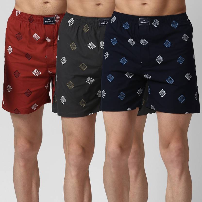Indulge in our super combed pure cotton Boxer Shorts from BUKKL. This has one back pocket with a buttoned closure. These boxer shorts are made from 100% Natural and soft Cotton grown in India. No harmful colors or chemicals are used in the making of this product, to ensure that there is no skin irritation to the user. These can also be worn as shorts with your favorite comfortable t-shirt while lounging at home, or as sleepwear. Styled with a buttoned placket and a fly in front along with a high quality elastic waist band ensure an utmost comfort. This product has a relaxed fit & medium rise. These cotton boxer shorts for men come in a pack of three colors. These shorts are 100% Made in India. So, what are you waiting for !!! Choose and play with you own colors as we are offering various color options.