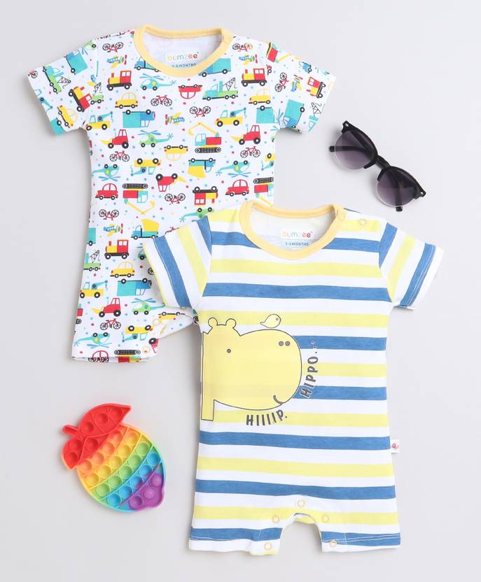 Grab these Cute, Babies Attractive design Thigh Length Romper for your little one from Bumzee. The comfy neck style and shoulder button opening ensures easy dressing. Kids will be comfortable and happy all day long in this Baby Rompers. Key features:- Toe Friendly Design for extra comfort, Very soft on Skin, 100% Super Soft Cotton, Colorful & Attractive Designs. Round Chest - 54 cms :: Length - 44 cms.