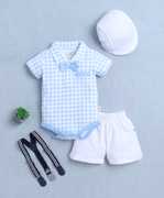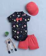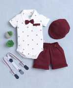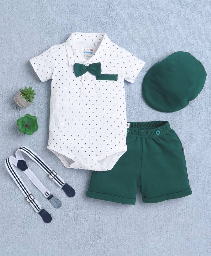 BUMZEE Baby Boys Party(Festive) Bodysuit Shorts, Suspenders, Cap (White & Bottle Green)