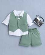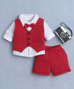 Need an instant outfit that's ready to party? This formal set has been designed in a smart, simple way for baby boy by Bumzee. It connects the soft 100% cotton shirt, waistcoat and Shorts, as well as the matching color bow tie. Your little baby will be best-dressed at his next event in this comfy (and cute) outfit! Our baby boy party clothes will have him ready to go exploring with friends, neighbors, and cousins, and still be family-photo ready. with smart shorts and full sleeved shirt, this coordinating set is finished with a smart waistcoat. whether your little boy wears these three pieces together or mixes them with other pieces, they are a versatile addition to his wardrobe. Note - The pocket in Waistcoat and pant is for show only. Shirt : Round Chest - 60 cms || Length - 39 cms :: Waistcoat : Round Chest - 60 cms || Length - 32 cms || To Fit Waist - 52 cms :: Length - 27 cms.