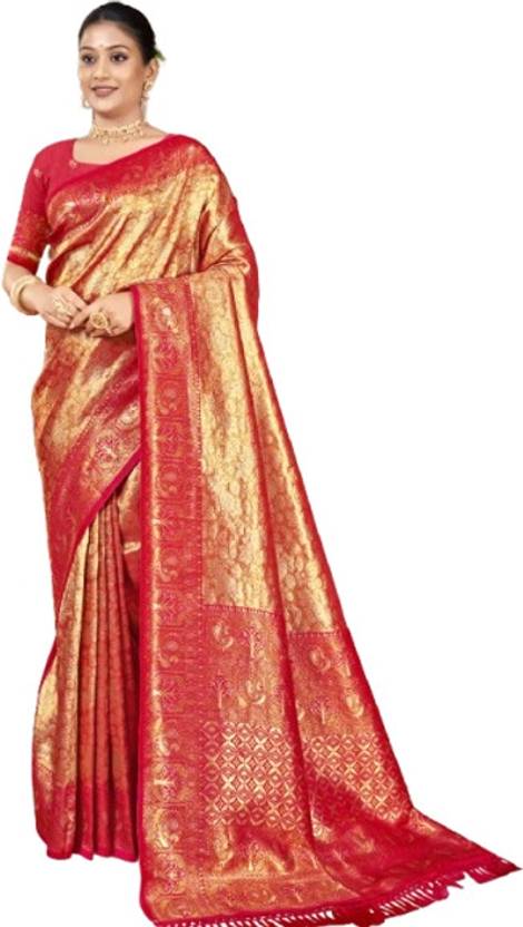 BUNAWAT Woven Kanjivaram Silk Blend Saree (Red)