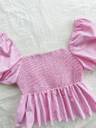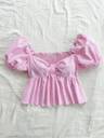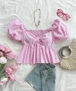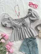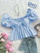 1 Pcs OF Cotton Stripe Puff Sleeve Shirt With Bow Tie, Peter Pan Crop Top