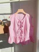 1 pc of Women's Cotton Striped Bow Tie Up Ruffle Hem Sleeveless Top Pink