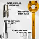 Byte Forge Premium Clutch & Socket Tool Kit is designed for bike mechanics, garage workshops, and DIY enthusiasts who need durable and reliable tools. This complete set includes a heavy-duty 4 Pin Clutch Holder, Super Splendor Clutch Nut, 12mm Deep Socket (1/2 Drive), and 8mm & 10mm Socket (1/4 Drive). Made from high-quality alloy steel, the tools are rust-resistant, strong, and built to handle high torque. Perfect for working on Hero Splendor, CD Deluxe, and other motorcycles. This kit makes clutch nut removal, socket tightening, and bike repairs easier and faster. Byte Forge is a trusted brand in hand tools and mechanic kits. Whether for professional use or home maintenance, this tool set ensures efficiency, durability, and professional results.