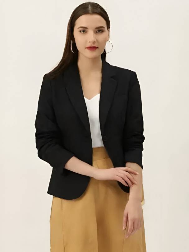this elegant black blazer for women, designed for both formal office wear and smart casual outfits. Made from high-quality fabric, this blazer offers a comfortable fit and a sleek. Perfect for meetings, parties, interviews, or daily workwear, it pairs with shirts, tops, and dresses