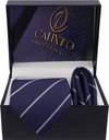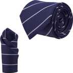 Elevate your formal style with the Calixto Men's Navy Blue Color Stripes Ties. This classic navy blue necktie features stylish stripes, adding a touch of sophistication to your outfit. Made from high-quality micropoly material, it boasts a silky feel and comes with a matching pocket square. Ideal for men who want to add a classic and stylish touch to their formal attire.