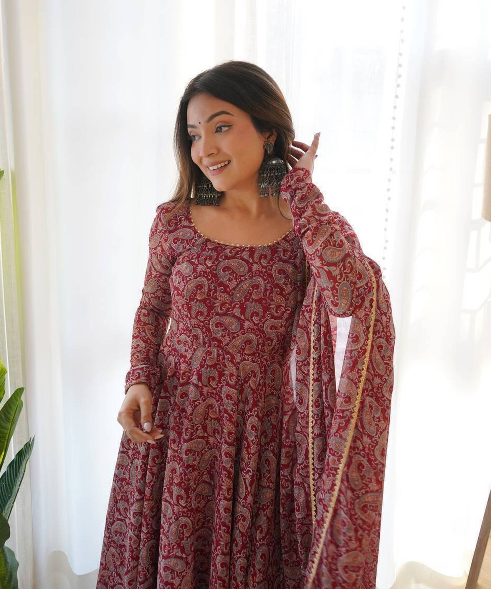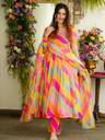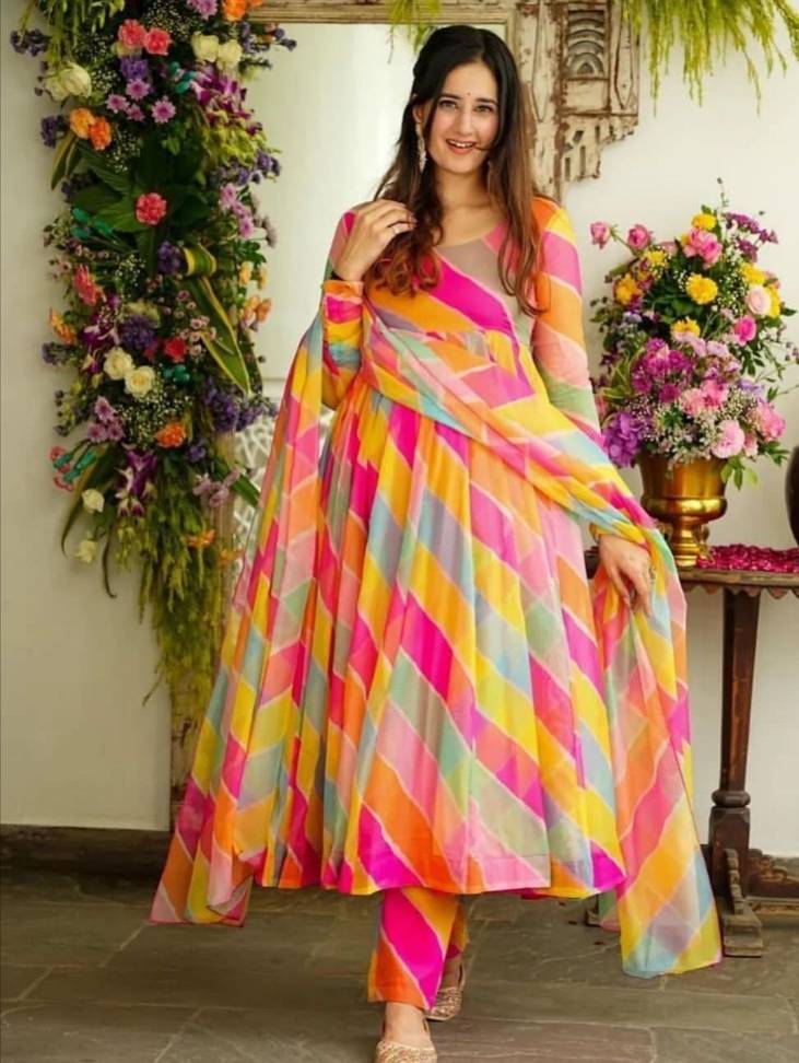 Elevate Your Ethnic Style Step into the spotlight with this stunning Anarkali Kurta, featuring a vibrant multi-colored Leheriya-inspired striped pattern. Designed for the modern woman who loves a touch of tradition, this kurta combines a timeless flared silhouette with contemporary bell sleeves (drama sleeves) to create a look that is both elegant and playful. Key Features: Fabric: Premium lightweight Georgette / Rayon (Adjust based on actual material) for a graceful flow and all-day comfort. Design: Eye-catching multi-color horizontal stripes in a traditional Rajasthani Leheriya style. Sleeve Style: Statement Three-Quarter Bell Sleeves that add a trendy, fashionable edge. Silhouette: Flared Anarkali fit that provides a beautiful drape and suits all body types. Occasion: Perfect for festive celebrations, Haldi/Mehendi functions, office parties, or casual ethnic outings. Style Tip: Pair it with white leggings or palazzos and statement jhumkas to complete the look.
