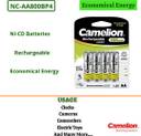 •Functional design: Set of 4 international Standard universally compatible rechargeable NI-CD batteries which can be used straight from the pack without initial charging., •Discharge: Batteries are equipped with low self-discharge mechanism to hold charge up to 80% without use, •Compatibility: Camelion AA Batteries are compatible with numerous devices including Remote Controls, Electronic Toys, Cameras, Flashlights, Torches and various other devices, •Environment friendly: Camelion batteries provide you a safe and stable highly protected environment friendly energy solution