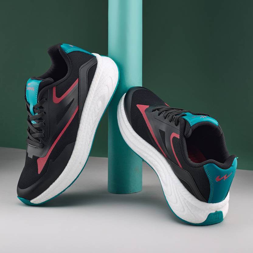 Brace yourself to meet the ultimate mix of power and bold style, the Campus JIVE Men's Running Shoes. The mesh, PU & PVC upper combo keeps it breezy and durable, while the EVA & TPR sole delivers comfort, grip, and flexibility. Experience new levels of cushioning with the Bubble Yoga Max insole, and let -Boost & Air-Turbo tech push you forward with unmatched energy return. Now, turn up the heat oh-so-effortlessly with these black sports shoes for men!
