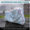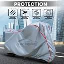 | Other Features | - Dual-Layer Protection: Engineered with a dual-layer design, our cover offers enhanced protection against scratches and abrasions, ensuring your bike's paintwork remains pristine even in challenging environments., Heat Shield Technology: Equipped with heat shield technology, our cover reflects sunlight and prevents heat buildup, safeguarding delicate bike components from potential damage and prolonging their lifespan., Anti-Scratch Lining: Lined with a soft, non-abrasive material, our cover protects your bike's frame and components from scratches and scuffs, preserving its aesthetic appeal and resale value over time., Customizable Fit: Our cover includes adjustable straps and drawstrings, allowing you to customize the fit according to your bike's dimensions, ensuring a snug and tailored fit for maximum protection.