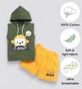 Introducing our adorable baby boy's green hoodie and shorts set, perfect for the summer season. Made from pure cotton sinker fabric with a weight of 170-180 GSM, this set offers comfort and breathability for kids aged 1 to 7 years. The sleeveless olive green hoodie t-shirt features a cute girl print, adding a touch of charm to the outfit. The mustard shorts complete the set, making it a stylish and practical choice for your little one.