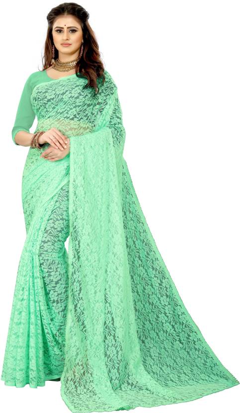 CARRYOX Solid/Plain Bollywood Net Saree (Green)