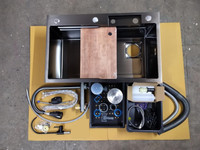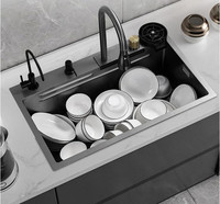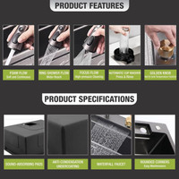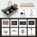 Featuring a comprehensive set, this modern and functional kitchen sink brings convenience to your kitchen. Sporting a complete package, it includes a kitchen sink, sink faucet, fruit basket, basket, cutting board, glass rinser, soap dispenser, RO water tap, and drainer, providing all the essentials for your culinary needs. So, whether you're a professional chef or a home cook, this kitchen sink is designed to meet your demands. This sink's foam flow offers soft and continuous water, the ring shower flow offers wide reach, the focus flow is ideal for high-pressure cleaning, the automatic cup washer lets you press and rinse cups, and the golden knob is ideal for hot and cold temperature options. And, with sound-absorbing pads, anti-condensation undercoating, a waterfall faucet, and rounded corners, this sink adds to the convenience.
