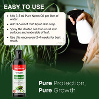 Courtesy of its straightforward preparation process, this herbal neem oil can be easily diluted for regular use. You can mix up to 5 ml of this oil with up to 1 L of water and add up to 5 ml of mild liquid dish soap. Furthermore, you can spray this mixture thoroughly on all leaf surfaces, including the undersides where pests often reside. For consistent results, you can apply this solution once every two to four weeks.