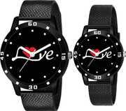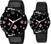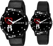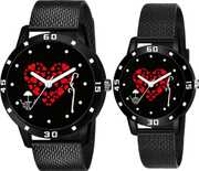 You may celebrate your love with these beautiful pair combo watches, which stand for devotion and unity. A delicate moment of love and connection is captured on the dial by a charming depiction of a couple sitting together with floating heart motifs overhead. The sophisticated and supple black rubber strap of these timepieces makes them perfect for both regular use and exceptional events. These well made watches offer exact timing as well as long-lasting durability. The basic design, with its contrasting white hands and clear dot markers, ensures easy readability. Whether you're looking for a matching piece of jewelry to flaunt your relationship or a romantic gift for your significant other, these couple combo watches are a terrific choice.