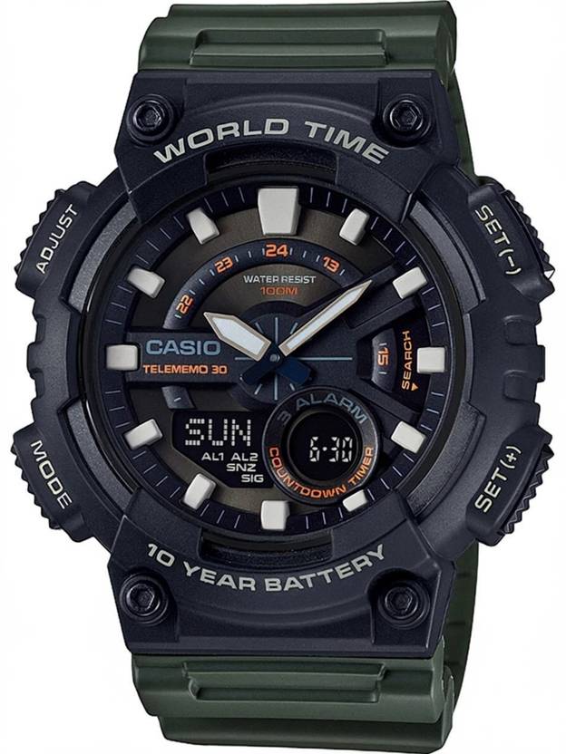 10-YEAR BATTERY LIFE, Resin Glass, Telememo (Memory capacity: Up to 30 sets of data, with 8-character name and16-digit telephone number), World time (Current time in 30 cities (29 time zones), daylight saving on/off), 1/100-second stopwatch, Countdown timer, Regular timekeeping (Analog: 2 hands (hour, minute (hands move every 20 seconds)), Digital: Hour, minute, second, am/pm, month, date, day), Accuracy: 30 seconds per month
