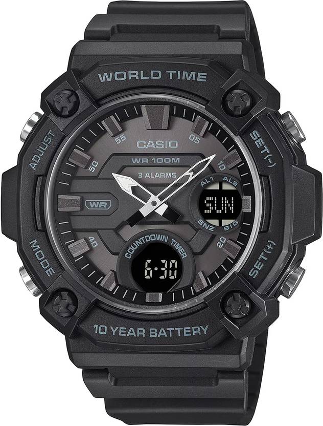 Satisfy both your practical and adventurous sides with an oversized case design that stands up to hard use. Featuring a large bezel and raised dial, these watches deliver a sturdy and robust design that is very easy to read. Water resistance up to 100 meters and a 10-year battery leave you free to focus on more exciting things. Handy alarm, timer, and world time keep you on track all day long.