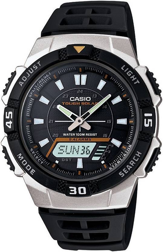 Tough solar, 1/100-second stopwatch, World time 29 time zones, 5 alarms, LED light (LCD part only), 100-meter water resistance, 6-language day of the week indicator (English, Portuguese, Spanish, French, German, Italian), Sporty design, 2 countdown timers