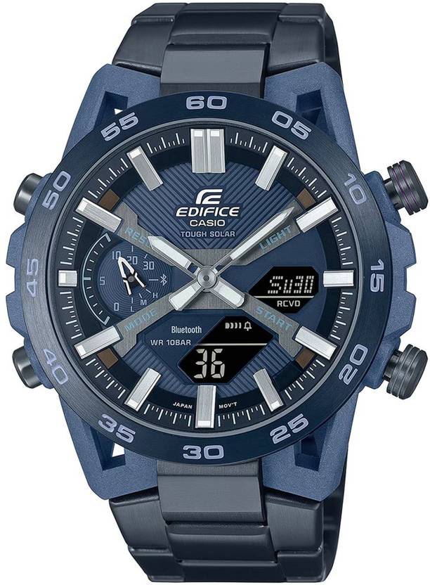 Slip into the drivers seat with the intensity of a race car driver. Introducing the cool-blue EDIFICE high-performance motorsports chronograph. The ECB-2000 SOSPENSIONE, with its design inspired by the suspension arms on formula race cars, takes on a carbon fiber-reinforced resin case made with indigo blue carbon a first for the EDIFICE line. The blue ion-plated bezel and band, together with the blue base tones of the dial, exude a cool stylishness that captures the icy concentration needed to dominate on the racetrack. Its a snap to sync with your smartphone via Bluetooth. Tap into the app to access functions that make life easier whether or not youre behind the wheel get automatically adjusted precision timekeeping, effortlessly manage the world time list of over 300 cities around the world, transfer stopwatch data measured to the millisecond to your smartphone, find your phone just by holding down a button on your watch, and more! Tough Solar charges the watch from sunlight or even fluorescent lamp light.