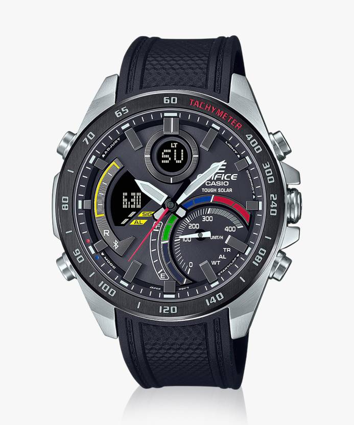 Sync with your smartphone via Bluetooth for precision timekeeping, wherever you go. Simply tap on the app to effortlessly manage functions like selecting a city from the World Time list. The large inset dial at the 4 oclock position boasts a speed indicator that displays average speeds when timing laps for set distances. The fully automatic LED light illuminates the dial and LCD with just a tilt of the wrist. Tough Solar charges the watch from sunlight or even fluorescent lamp light