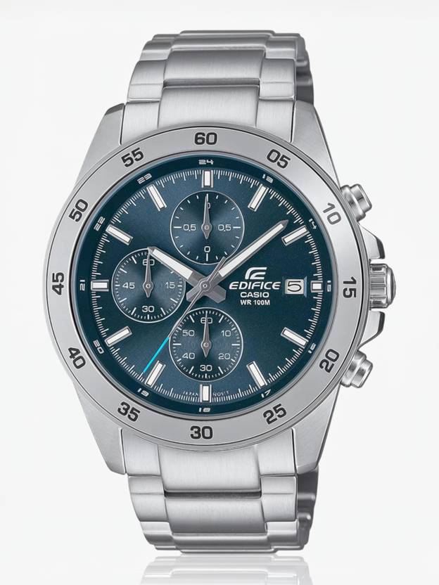 Elevate your style with a classic EDIFICE chronograph featuring a mid-sized case and finely detailed design. The solid stainless steel band is paired with a sophisticated grayish blue dial for a gentle design that exudes cool style.