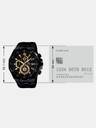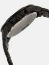 This watch has a black ion-plated band and case which gives it rigidity and makes it resistant to scratches. It has a mineral glass to protect the dial from damage and a rotating crown to set the time easily. The buttons on the side control the stopwatch.
