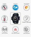 Vibration resistant, Neobrite, Sapphire Crystal, Mud Resistant, Solar powered, Time calibration signal reception, Digital compass, Altimeter(Measuring range: –700 to 10,000 m ( –2,300 to 32,800 ft.)), Barometer (Display range: 260 to 1,100 hPa (7.65 to 32.45 inHg)), Thermometer (Display range: –10 to 60°C (14 to 140°F)), World time (29 time zones (29 cities + coordinated universal time), daylight saving on/off, Home city/World time city swapping), 1/100-second stopwatch, Countdown timer, 5 daily alarms, Battery level indicator, Power Saving (display goes blank and hands stop to save power when the watch is left in the dark), Regular timekeeping (Analog: 3 hands (hour, minute (hand moves every 10 seconds), second), Digital: Hour, minute, second, am, pm, date, day), Accuracy: ±15 seconds per month (with no signal calibration)