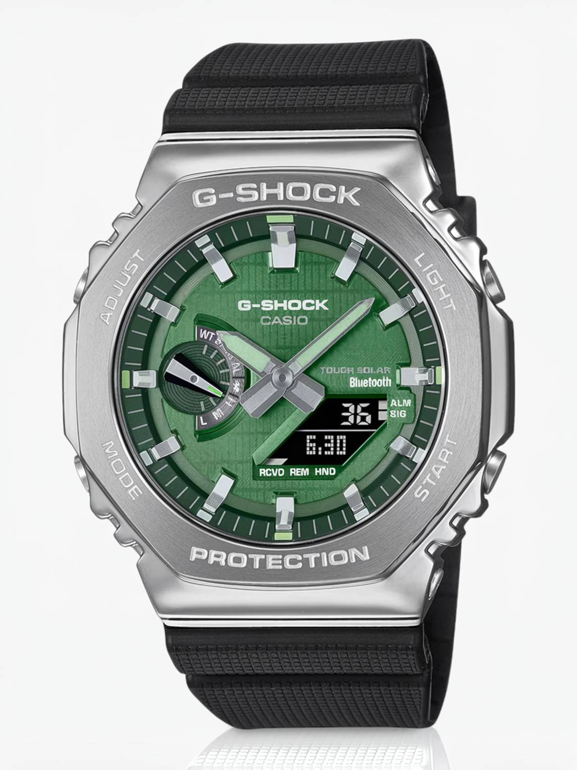 Metal-clad daring meets sophisticated gleam in a GBM-2100 that delivers Smartphone Link via Bluetooth and Tough Solar charging system, all in a meticulously finished metal design with iconic octagonal bezel. Choose from a basic black dial or metallic vapor deposition in blue or green, each complemented by a band made of environmentally responsible bio-based resin. Welcome to a whole new level of metal-clad 2100 functionality tough construction and stylish design in a timepiece that takes you from casual settings to business meetings without a thought.