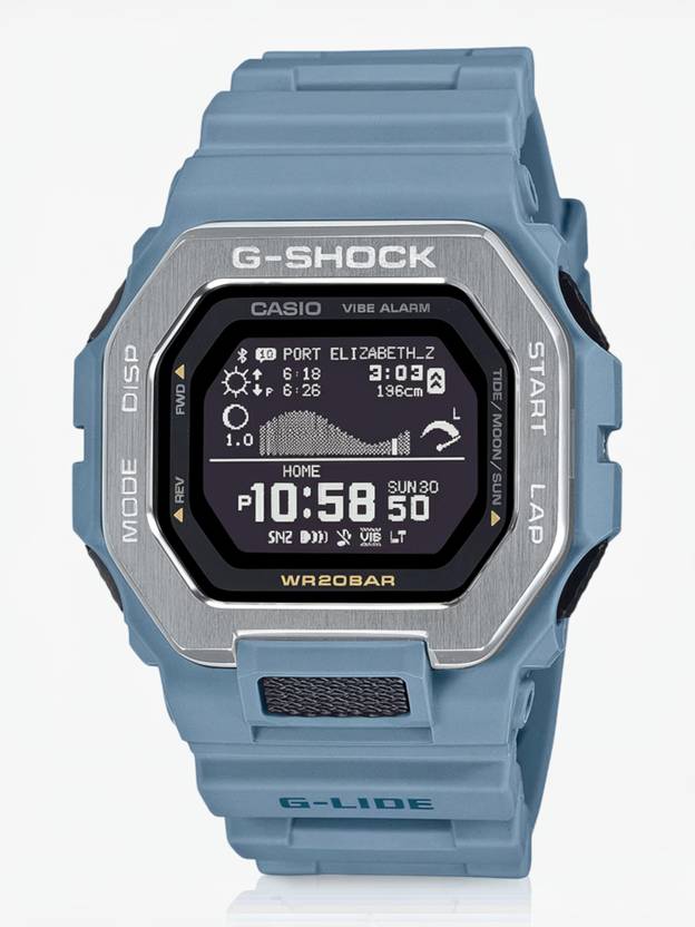 Take it to the waves with the GBX-100 smartphone-linked timepiece inspired by natural beach colors. From the G-LIDE sports line for the worlds top surfers and extreme sports fans. Just select one of 3,300 surf spots around the world on the dedicated smartphone app and send tide patterns, daylight conditions, and other location-specific information to the watch. The wide watch face with high-resolution Memory in Pixel (MIP) LCD provides the same clear readings of tide graphs and moon age as previous models, as well as high/low tide times and levels, and sunrise/sunset times all at a glance. Surfers who compete in tough competitions around the world appreciate both training and surfing functionality. The GBX-100 tracks distance traveled, pace, laps, and cadence, as well as a whole range of surfing metrics, all delivered straight to your wrist. The bezel, a fusion of resin and metal, is designed for distinction. Contrasting honing and hairline finishes on the stainless-steel upper bezel add the final touch to a sporting timepiece that delivers both strength and a sharp, elegant look. With unstable environments in mind, the watch features a resin guard structure to withstand impact from above, below, and both sides, as well as a guard structure for the button at the 6 oclock position, to deliver all the shock resistance you expect from a G-SHOCK. The band is made of soft bio-based urethane with a slit at the base of the 6 oclock position, for a better fit and the water and sweat runoff that makes for comfortable wearability so you can concentrate on riding the waves. Choose your favorite G-LIDE in one of two natural beachy colors the beautiful blue of the ocean or the soft sandy beige of the beach.
