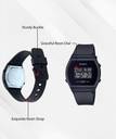 Flash alert::Flashes with buzzer that sounds for alarms, hourly time signal::1/100-second stopwatch::Measuring capacity: 00'00"00~59'59"99 (for the first 60 minutes) 1:00'00~23:59'59 (after 60 minutes)::1/100 second (for the first 60 minutes) 1 second (after 60 minutes)::Elapsed time, split time, 1st-2nd place times::Countdown timer::Multi-function alarm::Hourly time signal::Full auto-calendar (to year 2039)::12/24-hour format::Regular timekeeping: Hour, minute, second, pm, month, date, day::Accuracy: 30 seconds per month::Approx. battery life: 3 years