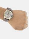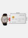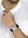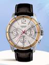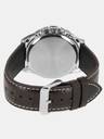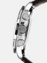 The silver casing and the bezel is ion-plated for extra durability. The dial cover is protected by mineral glass. The dark-brown leather strap, featuring a contrasting stitching, comes with a buckle clasp for secure fit.