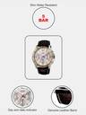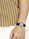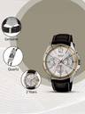 The stainless steel casing comes with a water resistance rating of 50 m, meaning it can repel off accidental spills. This wristwatch comes with a silver dial that is marked with silver numerals and markers, and black outer markers, making this watch anything but styled. The three sub-dials feature hour, day and date. The dial also features a three-hand design, with white hour and minute hands and a red second hand for extra visibility. Time can be adjusted using the rotating crown while the sub-dials can be accessed using the two pushers.