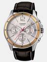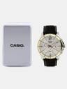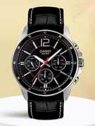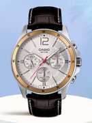 With its large round dial and a curved stainless steel case with closed lugs that look clean as it meets up with the black leather strap, this classically handsome Enticer watch from Casio can add flair to your look.