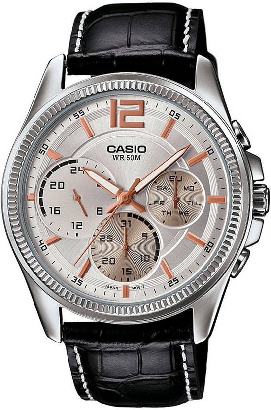 Regular timekeeping: Analog: 3 hands (hour, minute, second), 3 dials (date, day, 24-hour)