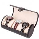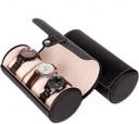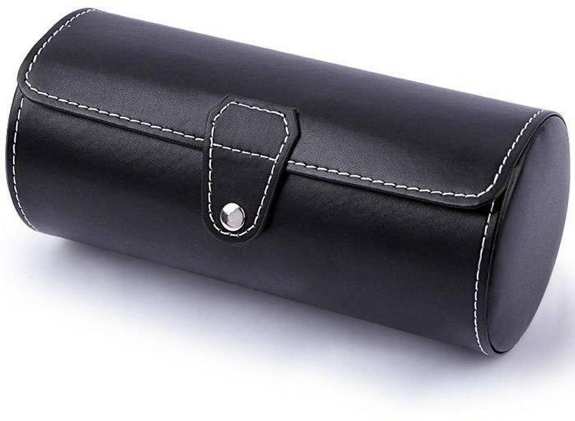 Premium PU Leather Round Shape Watch Case for Travel with Lock and Cushion Black Watch Box (Black, Holds 3 Watches)