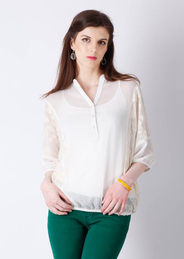 Flatter your silhouette and look elegant by donning this casual wear from the house of AND. The white top features a V-neck. Club this top with a pair of faded jeans and peppy coloured moccasins. Carry a fancy handbag and complete your attire.